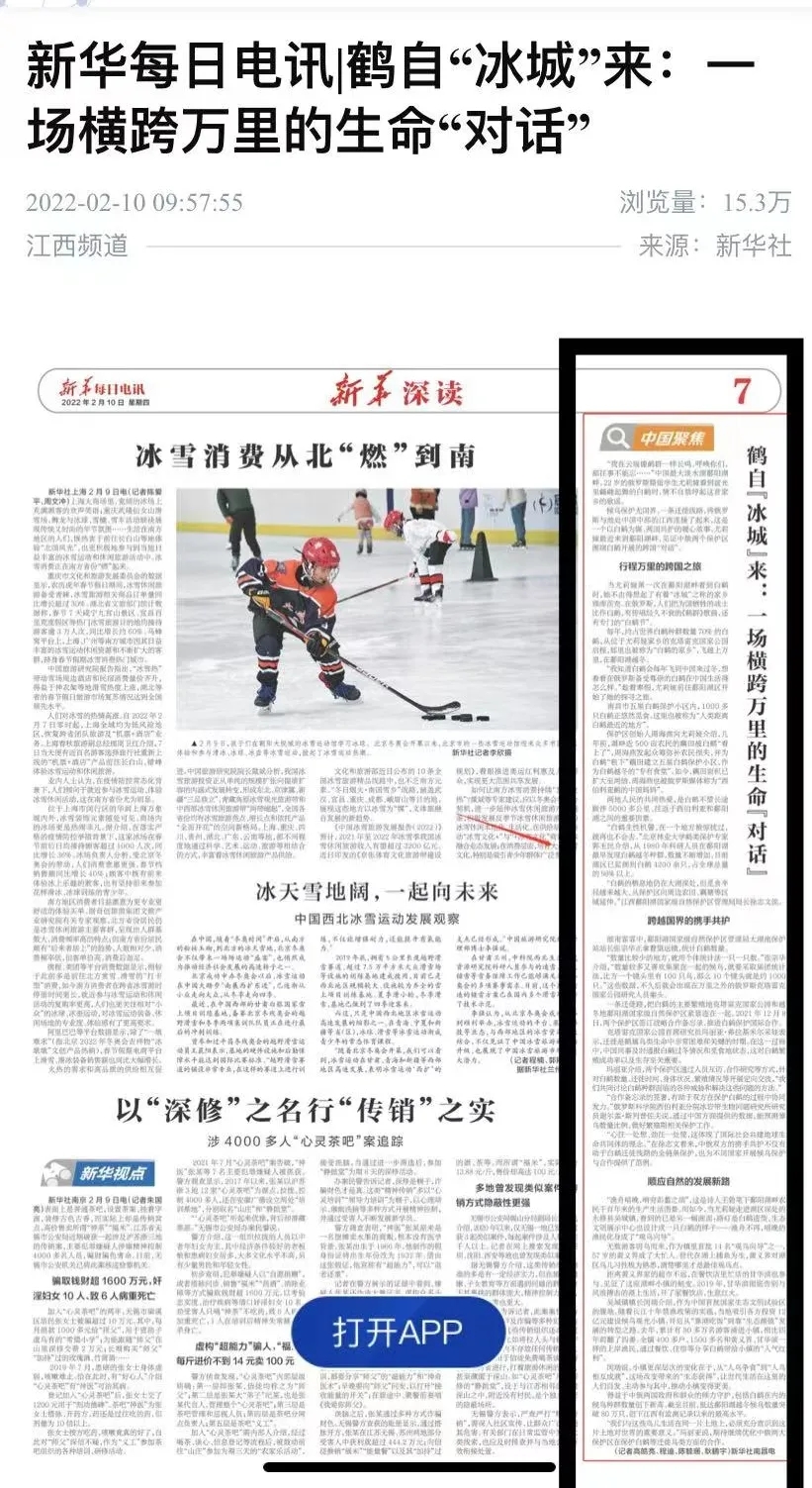 中央级报刊《新华每日电讯》和新华社客户端报道尤莉娅与鄱阳湖畔的白鹤开展一场横跨万里的生命“对话”。