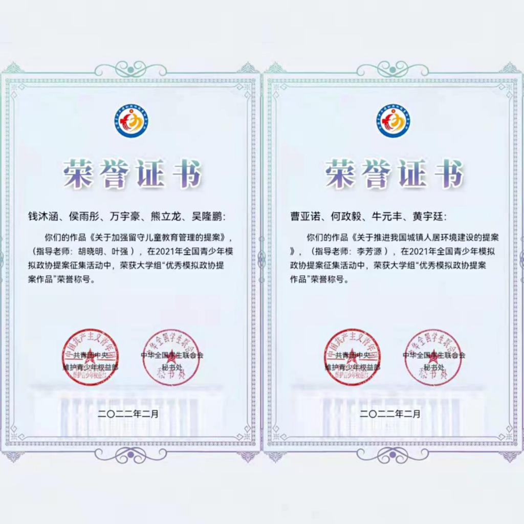 近日,2021年全国青少年模拟政协提案征集活动评审结果揭晓,beat365官网《关于加强农村留守儿童教育管理》《关于推进我国城镇人居环境建设》两项提案荣获优秀模拟提案作品奖,位列全省高校第一(全省高校共4项)。