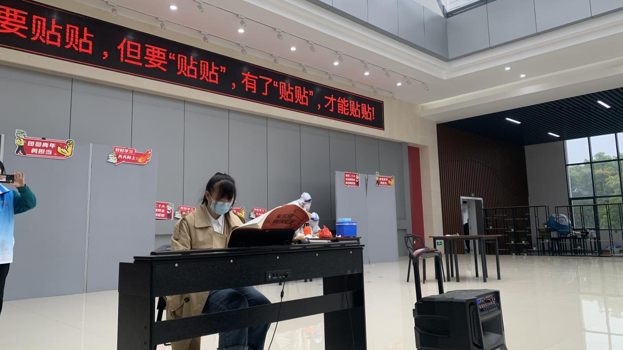 艺术学院学生王思雅在第3轮核酸检测现场演奏钢琴曲。
