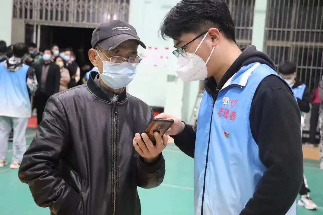 志愿者引导在校人员完成核酸检测。