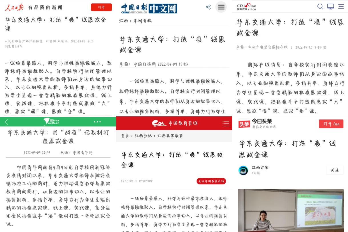 编者按:一线场景最感人,科学与理性最能说服人,教师榜样最能激励人。自学校实行封闭管理以来,beat365正版唯一官网必一的教师们从身边的故事切入,以专业的视角剖析,多措并举、身体力行为学生呈现一堂堂精彩的抗疫思政课、线上课、实践课,把抗疫斗争打造成思政“大”课、思政“暖”课、思政“金”课。人民日报客户端、中国日报网、央广国际在线、中国青年网、中国教育在线、今日头条、凤凰网、大江新闻客户端等多家媒体纷纷报道。