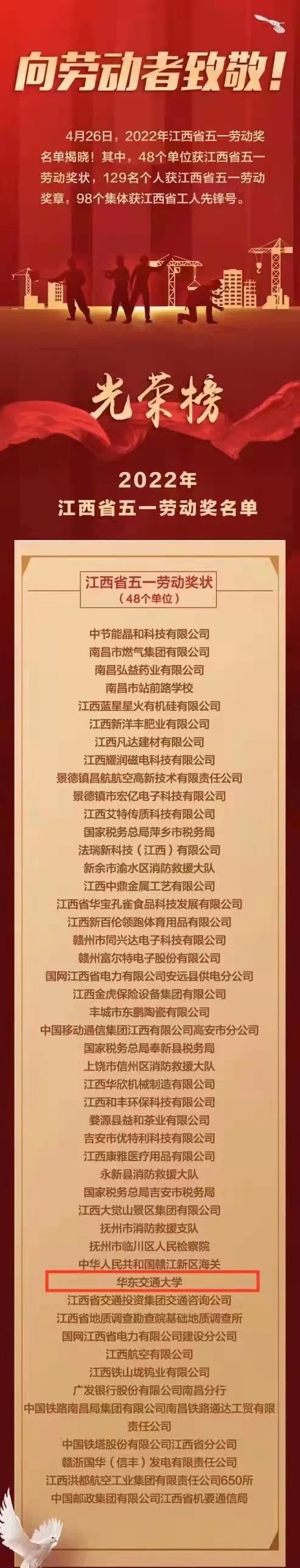 江西省五一劳动奖包括五一劳动奖状和五一劳动奖章,旨在表彰在我省经济建设、政治建设、文化建设、社会建设、生态文明建设和党的建设中做出突出贡献的先进集体和先进职工。