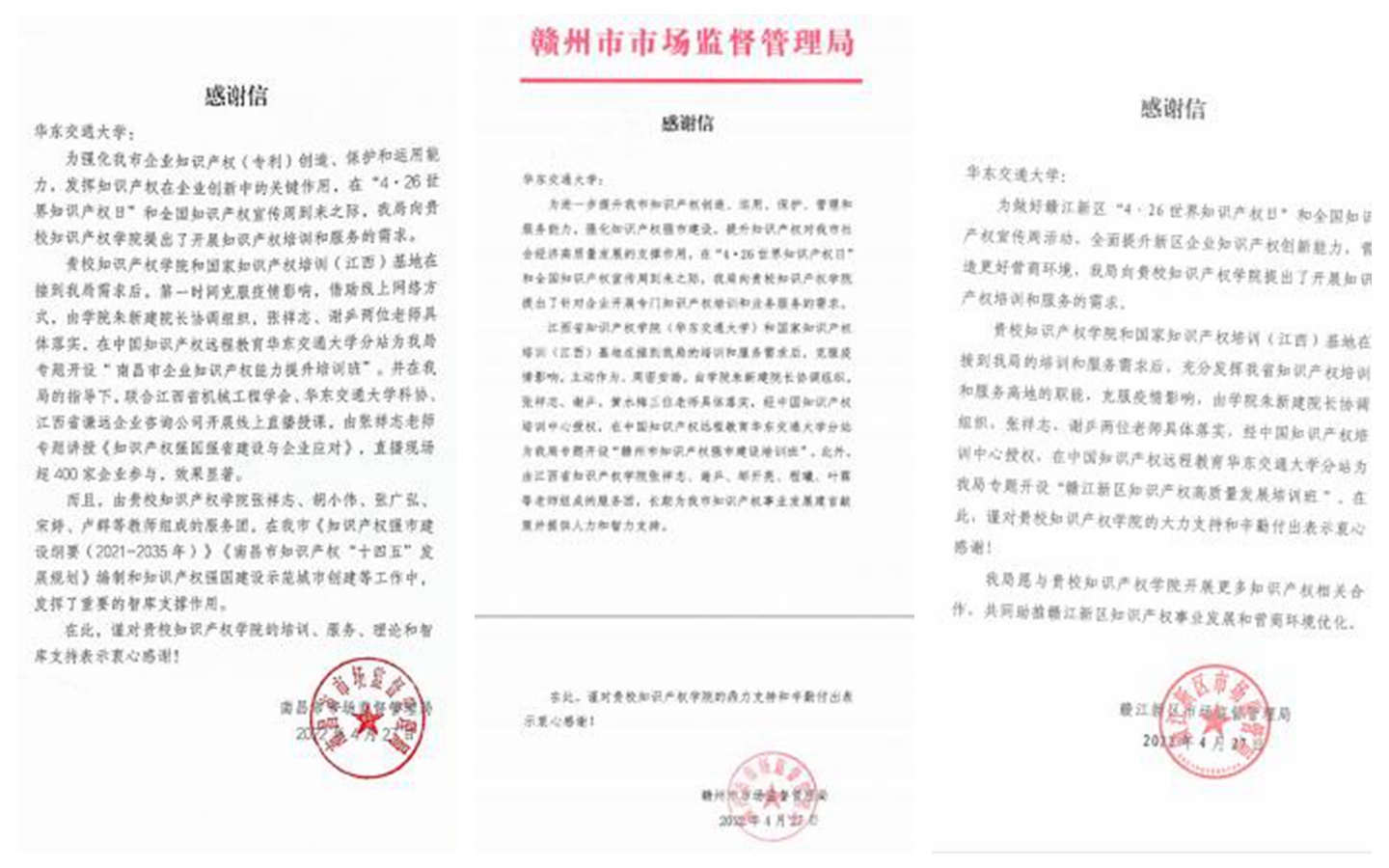 近日,beat365官网知识产权学院收到了来自南昌、赣州、九江、抚州、赣江新区等5个设区市和国家级新区市场监督管理局(知识产权局)的感谢信,感谢知识产权学院及其教师服务团队在南昌市和学校抗疫攻坚克难时期,主动作为、勇于担当,为江西省地方知识产权事业发展提供强有力的支持和服务。
