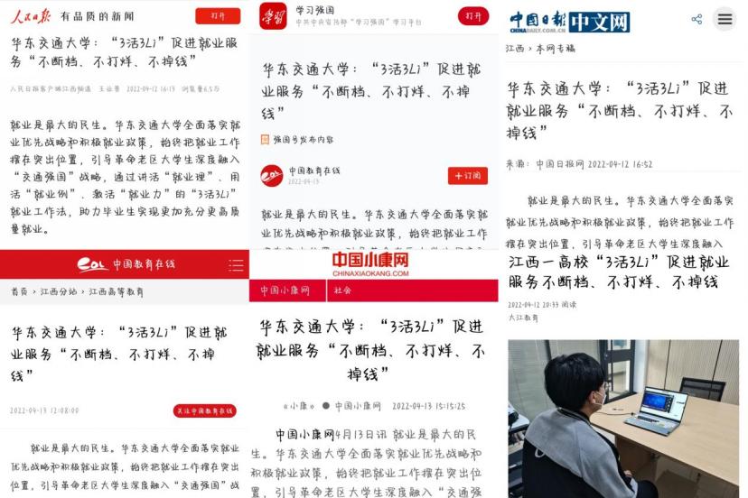人民日报客户端、人民网、学习强国、中国日报网、中国教育在线、中国小康网、今日头条、凤凰网、大江新闻客户端等多家媒体纷纷报道“3活3Li”就业工作法