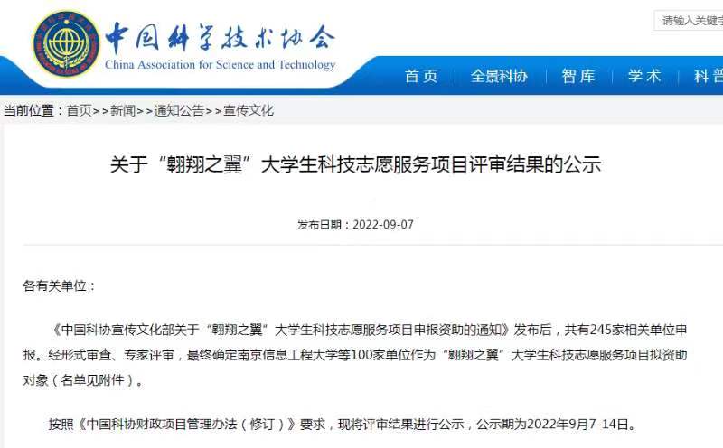据悉,“翱翔之翼”大学生科技志愿服务项目旨在鼓励和支持有条件的高校与科技馆、科普教育基地、新时代文明实践中心(所、站)等依托机构合作,开展具有创新性、有特色、项目化的科技志愿行动,厚植高校大学生家国情怀,践行和弘扬科技志愿服务精神。此次全国共有245家单位申报,经形式审查、专家评审,最终100家单位获批资助。