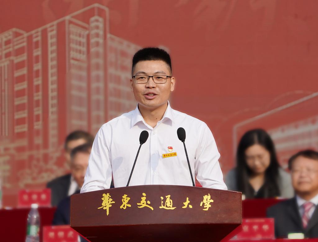 新生佩戴校徽宣誓仪式上,全体新生整装肃立,郑重地将校徽佩戴至左胸前,戴上这枚徽章,就接过了“铁”的接力棒,有了斩不断的“铁”之印记和磨不灭的“铁”之使命,开启了“铁”的新征程。“遵循‘日新其德、止于至善’的校训,争做新时代铁人铁军,力做有理想、敢担当、能吃苦、肯奋斗的新时代华交青年......”新生右手握拳,铮铮誓言激发着奋进的力量。