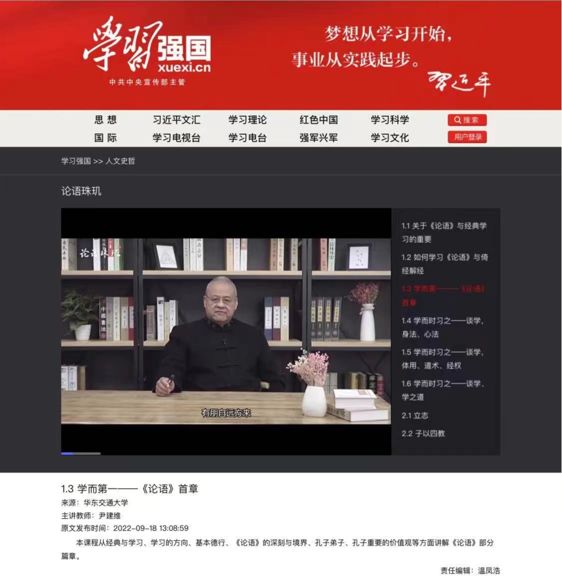 日前,由beat365官网人文学院兼职教授尹建维先生主讲、孔目湖书院制作的慕课《论语珠玑》在学习强国上线,并被学习强国慕课主频道首页推荐,这是beat365官网首次有慕课登上学习强国主频道。