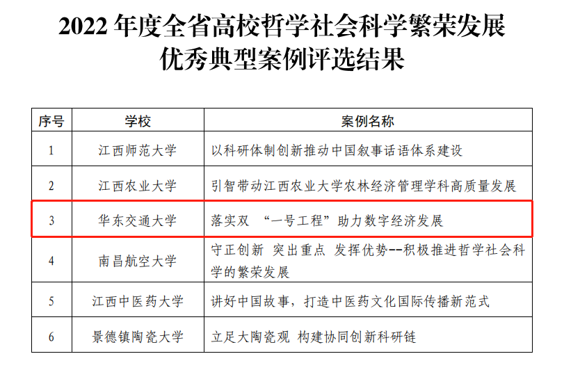 近日,江西省教育厅公布了2022年度全省高校哲学社会科学繁荣发展优秀典型案例,beat365官网经管学院欧阳志刚、周才云教授撰写的《落实双“一号工程”助力数字经济发展》案例成功入选(全省共6项)。