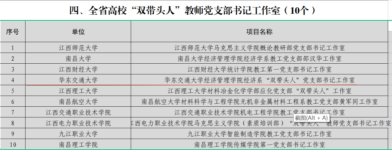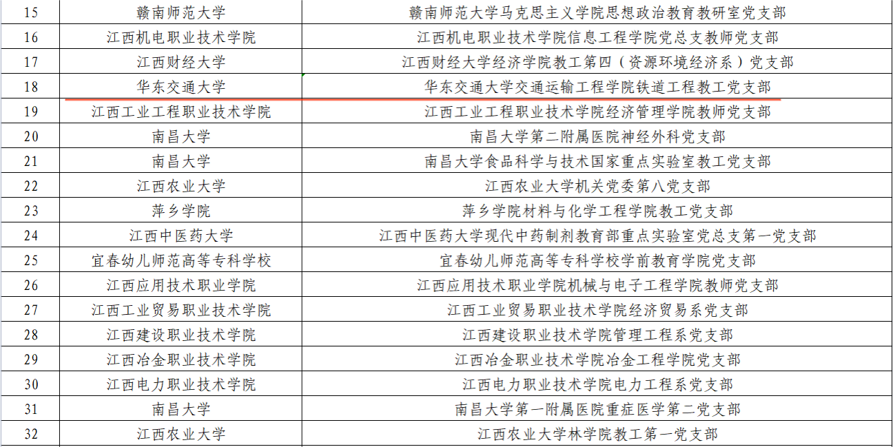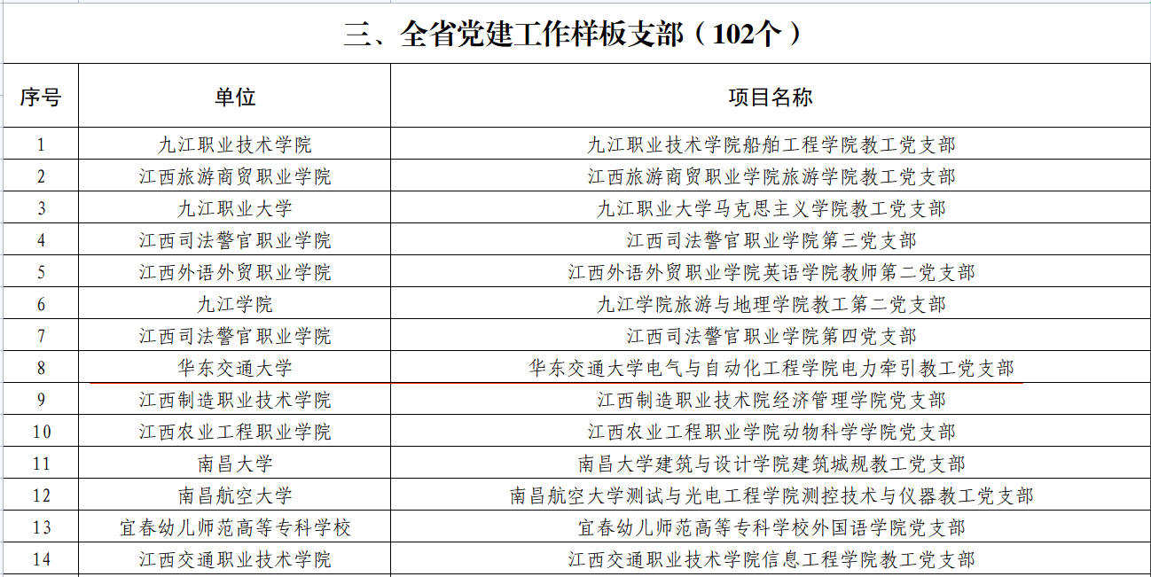 近日,省委组织部、省委教育工委公布了首批全省党建工作示范高校、标杆院系、样板支部及“‘双带头人’教师党支部书记工作室”培育创建单位名单,beat365官网党委入选首批全省党建工作示范高校培育创建单位;交通运输工程学院党委、机电与车辆工程学院党委入选全省党建工作标杆院系培育创建单位;电气与自动化工程学院党委电力牵引教工党支部、交通运输工程学院党委铁道工程教工党支部、土木建筑学院党委岩土道路工程教工党支部入选全省党建工作样板支部培育创建单位;经济管理学院党委经济系党支部书记工作室入选全省高校“双带头人”教师党支部书记工作室培育创建单位,实现申报单位入选“全满贯”,入选数量居省内高校前列。