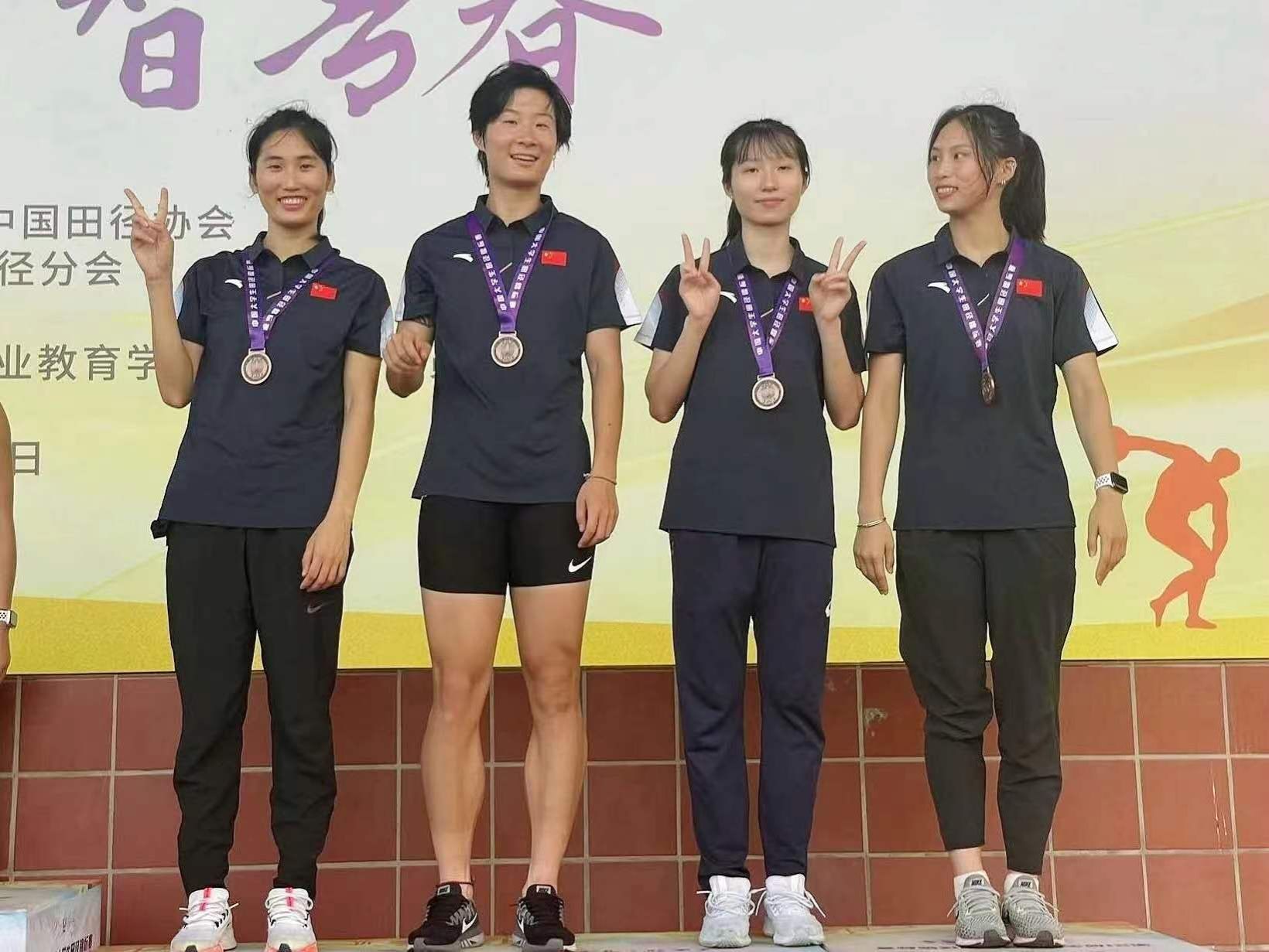 beat365官网学子宋祖微、甘国雪、吴峥、薛亚农夺得女子丁组4×400米接力铜牌。