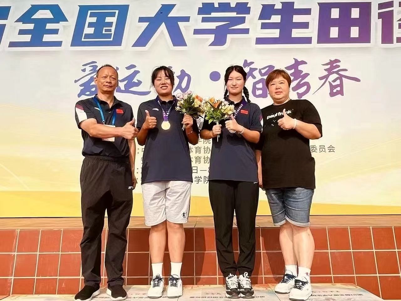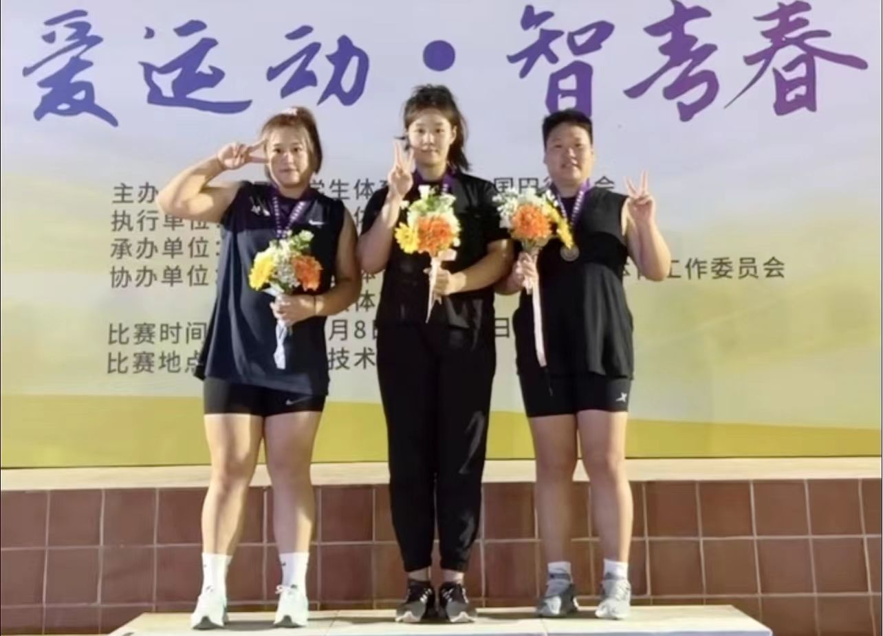 beat365官网学子徐鑫颖(左2)夺得女子丁组链球金牌、叶嘉怡(右2)夺得铜牌。