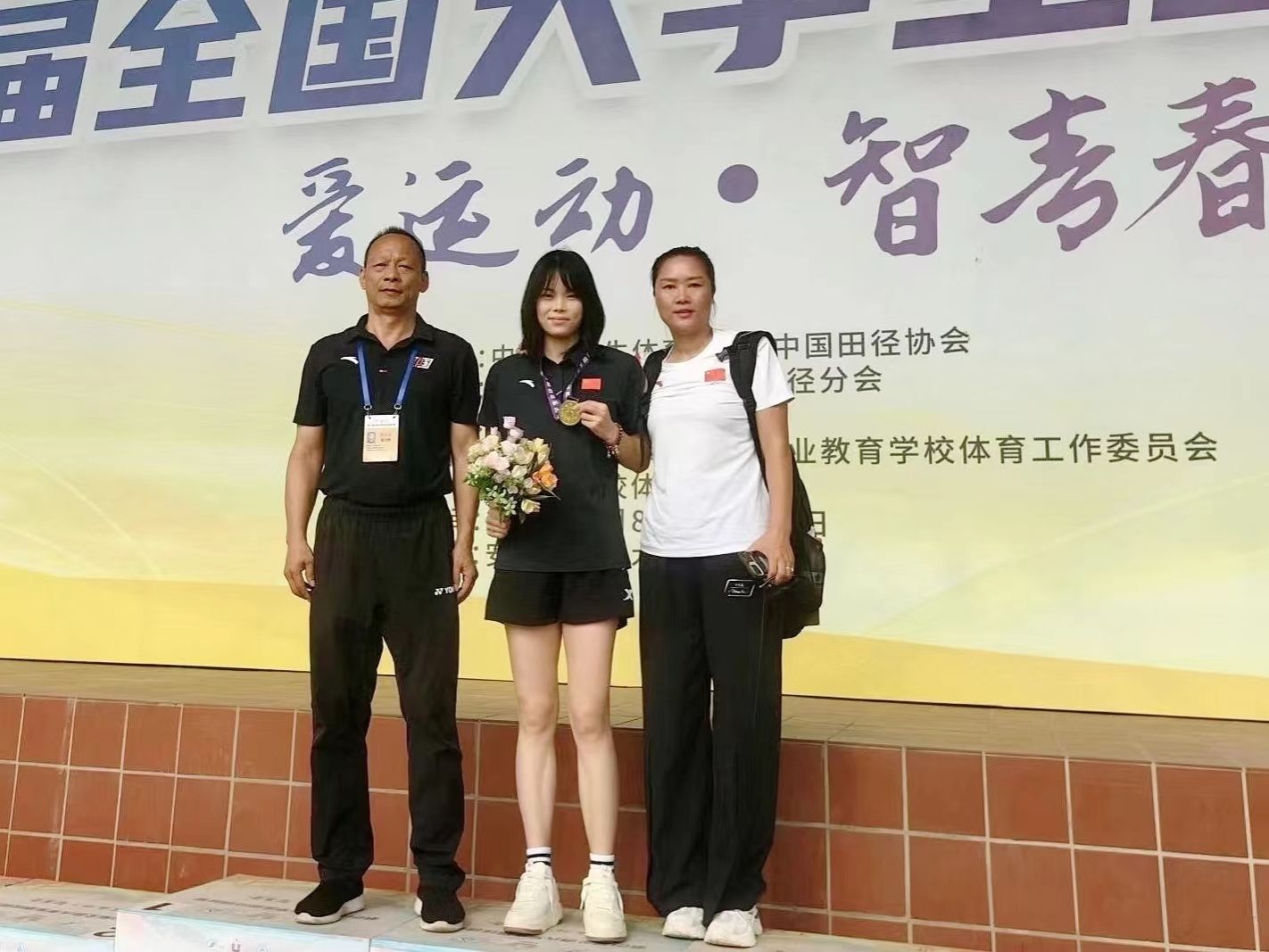 beat365官网学子钟嘉未(中)夺得女子丁组跳远金牌并打破赛会纪录。