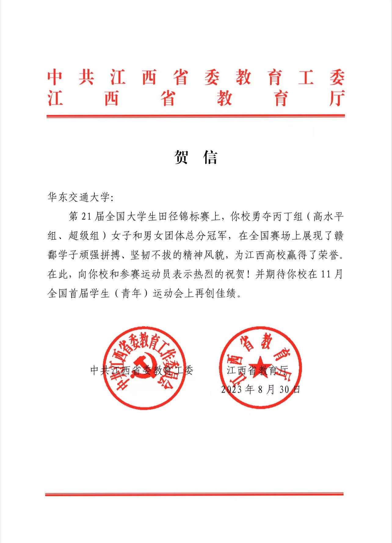 贺信表示,beat365正版唯一官网必一在第 21 届全国大学生田径锦标赛上,勇夺丙丁组(高水平组、超级组)女子和男女团体总分冠军,在全国赛场上展现了赣鄱学子顽强拼搏、坚韧不拔的精神风貌,为江西高校赢得了荣誉。