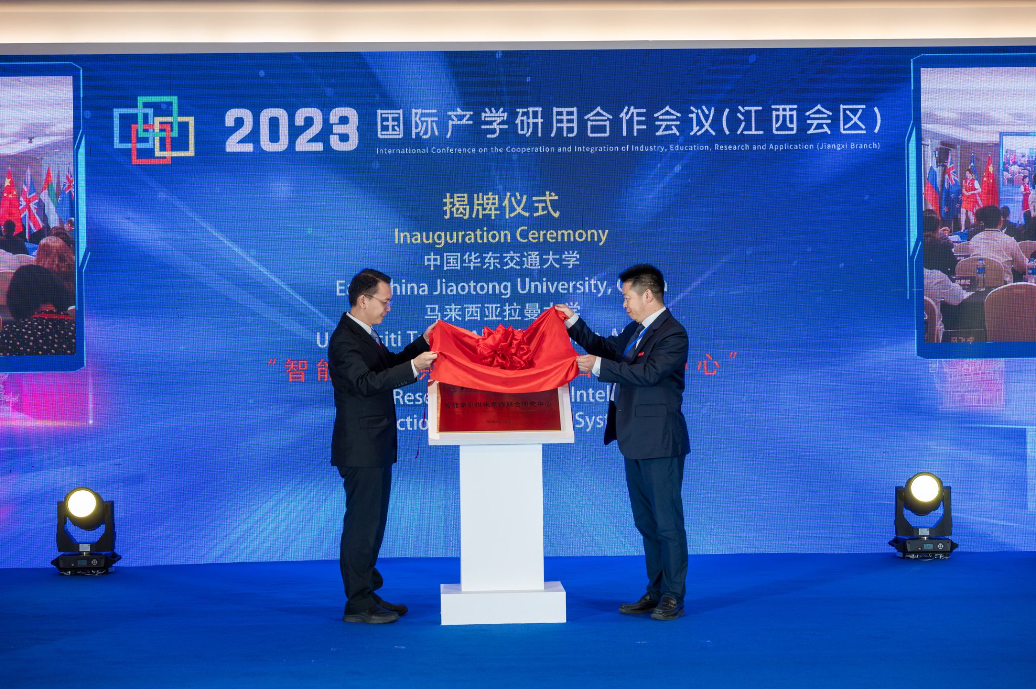 校党委书记柳和生与马来西亚理工大学交通系统与工程研究院海事科研技术中心主任KANG Hooi Siang代表双方为中马智能新能源汽车联合实验室揭牌。