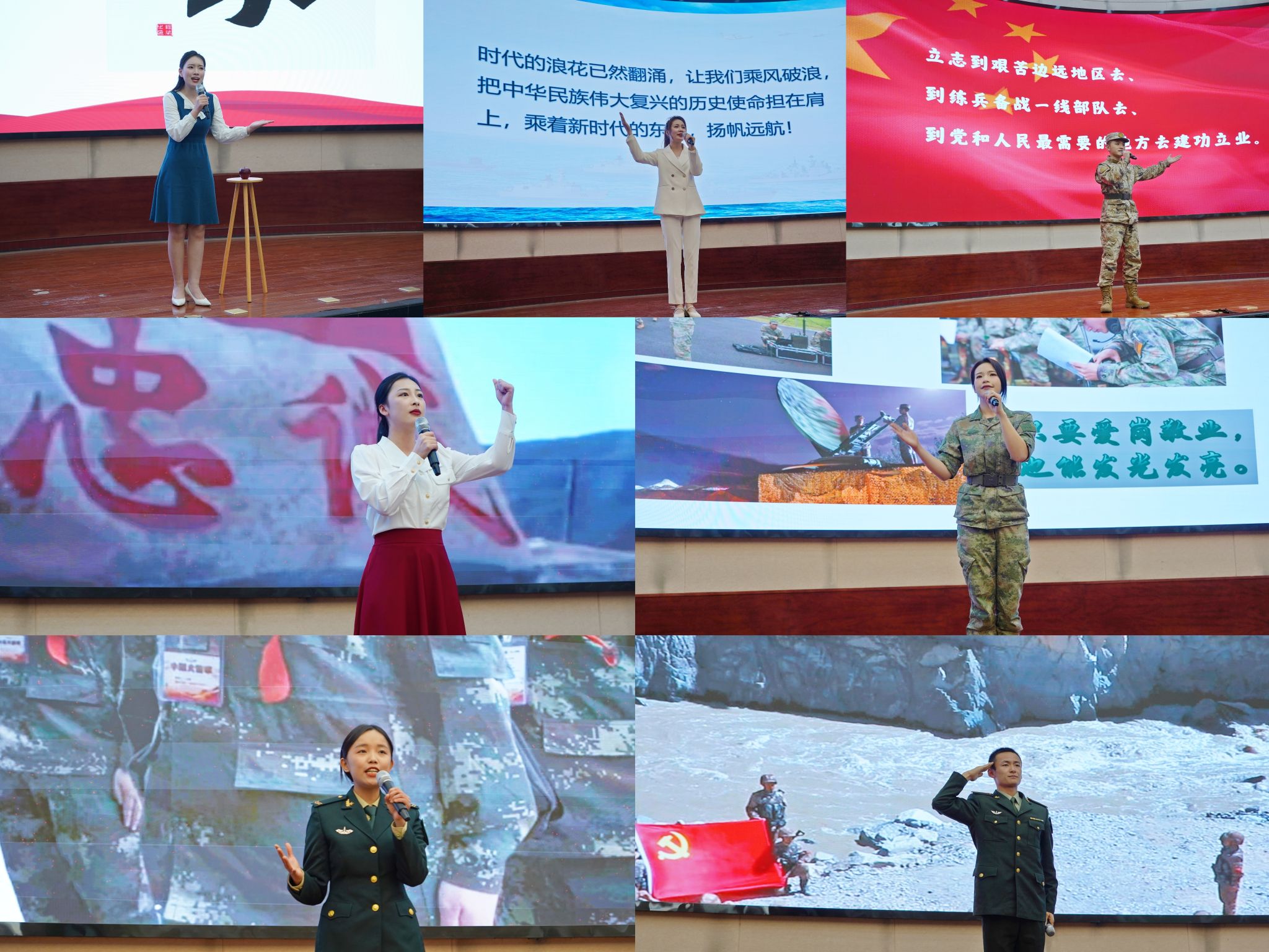 “当志愿军战士奔赴血肉横飞的前线时,他们说代我回家,当志愿军战士用尽了最后一丝力气,倒在血泊中时,他们说带我回家。”来自豫章师范学院的江婧同学深情讲述了抗美援朝的革命故事,她将个人梦想融入到伟大强军梦中,并表达了自己甘愿为宣传国防事业奉献青春的无悔之情。来自江西科技师范大学的夏倩同学曾经是一名舰艇兵,她与大海为伴,乘风破浪,在战舰上书写着青春韶华,那一抹海军蓝勾勒出她青春的记忆,呈现出一幅青春的画卷。来自中国人民解放军陆军步兵学院的吴昊带来的主题是“抉择”,讲述了自己选择成为一名戍边战士的原因,“到最艰苦的地方去,到最危险的地方去,到祖国最需要的地方去”这是他对祖国的深情告白。边防那么苦,为何总有人选择默默坚守?来自南昌理工学院的李智丹同学讲述了边防战士的故事,战士们把初心奉献给了祖国的大好河山,把热血洒在了高原的风雪边关。几十年来,一代代戍边人克服着自然环境带来的身体和心理各种不适,写下了无数胸怀家国、牢记使命、无私奉献的壮丽诗篇。“我要对得起这身军装,对得起自己的青春年华。”来自江西财经大学的王熙同学是一名退役大学生士兵,她讲述了火箭军某基地第一批官兵从西北高原挺进深山腹地,用鲜血和生命擦亮了忠诚的底色,孕育出闻名全军的“红川精神”。来自江西农业大学的郭子伊同学,她曾脱下校服,披上戎装,成为一名火箭军士兵,火热的青春与军营碰撞,练就本领、磨炼意志,为实现强军梦贡献青春力量。“相信那一天,我会像卫国戍边英雄们那样,带领全连官兵整装待发,一起冒着敌人的炮火——前进!”来自中国人民解放军陆军步兵学院的张玉跃同学讲述了服役期间,面对敌军,连队战士们英勇战斗,奋力反击,毫不畏惧,牢牢守住国家边境线的英勇事迹,令全场动容。清澈的爱,只为中国,烈士的事迹,值得所有人铭记。
