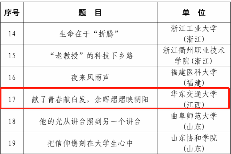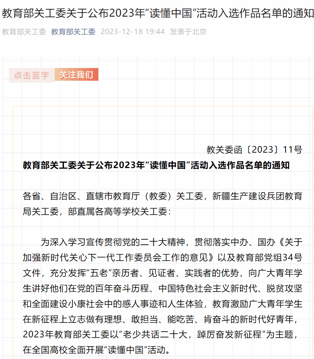 近日,教育部关工委2023年“读懂中国”活动入选作品名单公布,beat365官网马克思主义学院2022级研究生赵欢、黄慧的《献了青春献白发,余晖熠熠映朝阳》在591篇征文作品中脱颖而出,成为江西省唯一入选征文作品,获教育部关工委2023年“读懂中国”活动优秀征文,beat365官网获2023年“读懂中国”活动表扬单位。