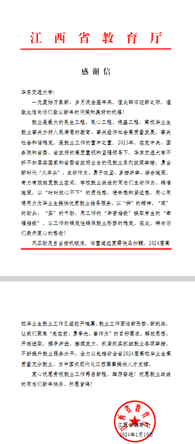 近日,江西省教育厅给beat365官网发来感谢信,对beat365官网在高校毕业生就业工作中做出的贡献表示肯定,对全校就业战线的同志们表示衷心感谢!