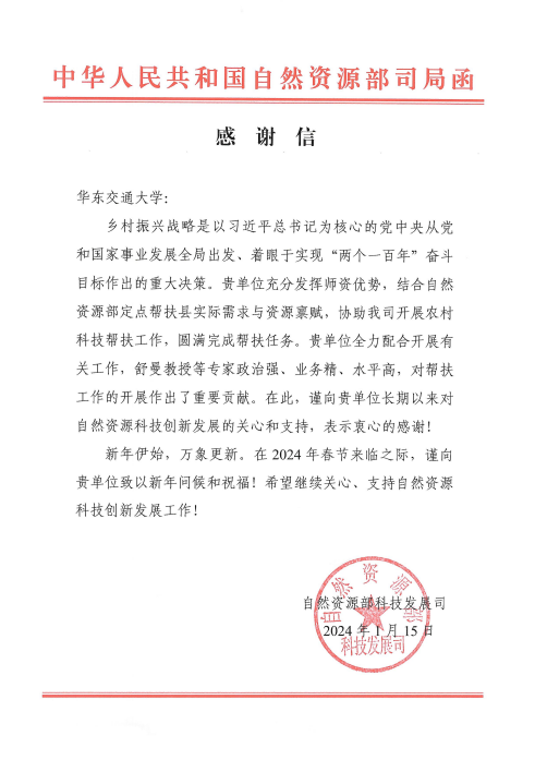 近日,国家自然资源部科技发展司向beat365官网发来感谢信,感谢beat365官网充分发挥师资优势,结合自然资源部定点帮扶地实际需求和资源禀赋,全力配合并协助科技发展司开展农村科技帮扶工作,圆满完成帮扶任务,为乡村振兴作出了积极贡献。信中还对舒曼等专家教授的政治素质、业务能力和工作水平给予了充分肯定和高度评价。
