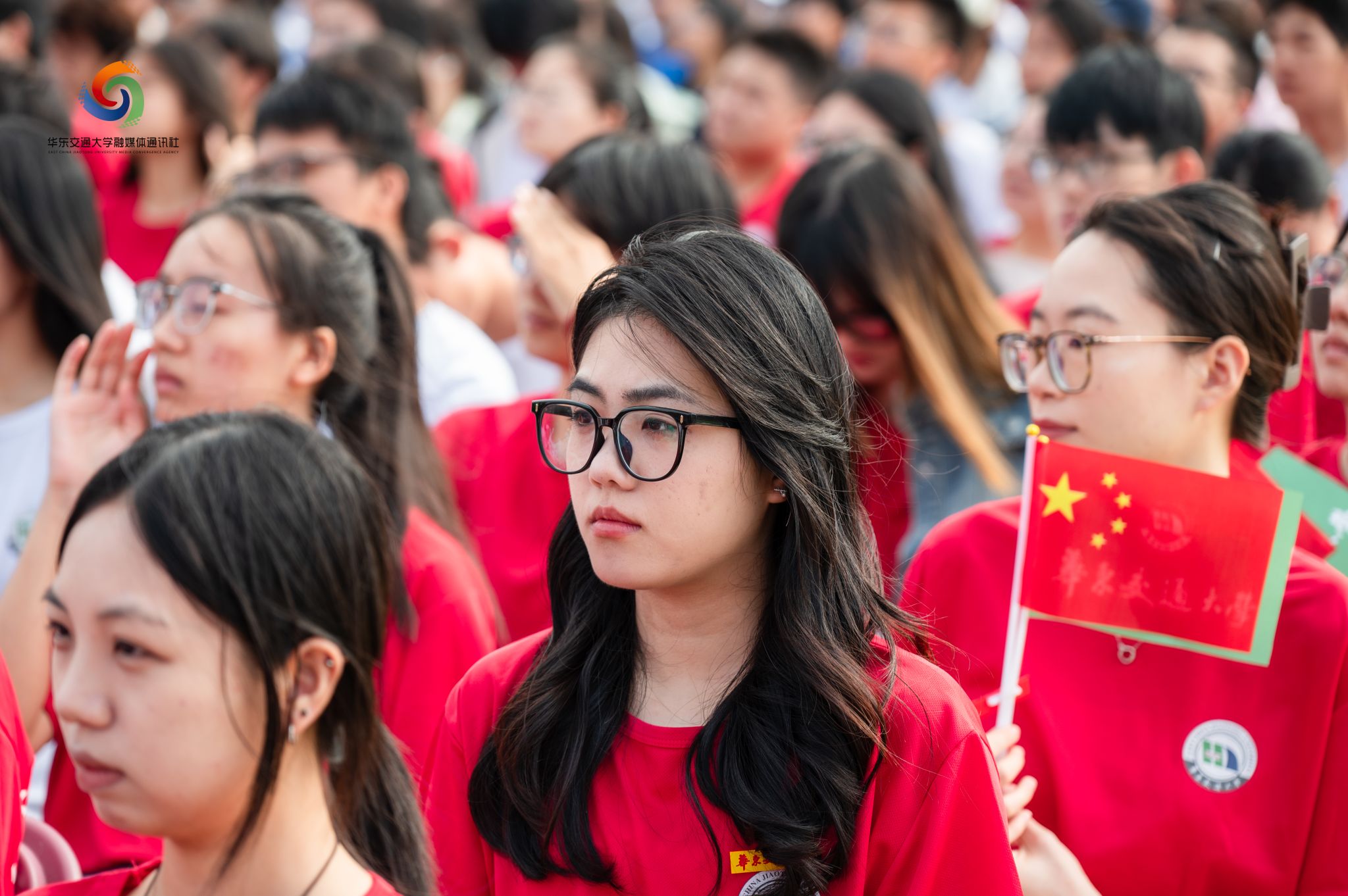 “谨记‘日新其德,止于至善’的校训,秉承‘团结、求实、创新、奋进’校风。争当‘铁心铸忠诚、铁血报家国、铁肩担使命、铁手创大业’的新时代铁人铁军!”——在典礼的高潮部分,全体新生集体宣誓,向祖国致以青春的礼赞,向华交许下青春的誓言。