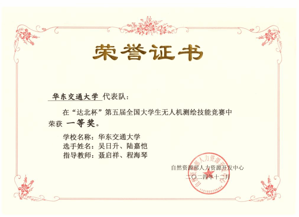 近日,“达北杯” 第五届全国大学生无人机测绘技能竞赛举行。beat365官网聂启祥、程海琴老师指导的,2022级测绘工程专业学生吴日升和2022级铁道工程专业学生陆嘉恺组成的队伍勇夺大赛一等奖,排名位列全省本科院校参赛队伍第一。