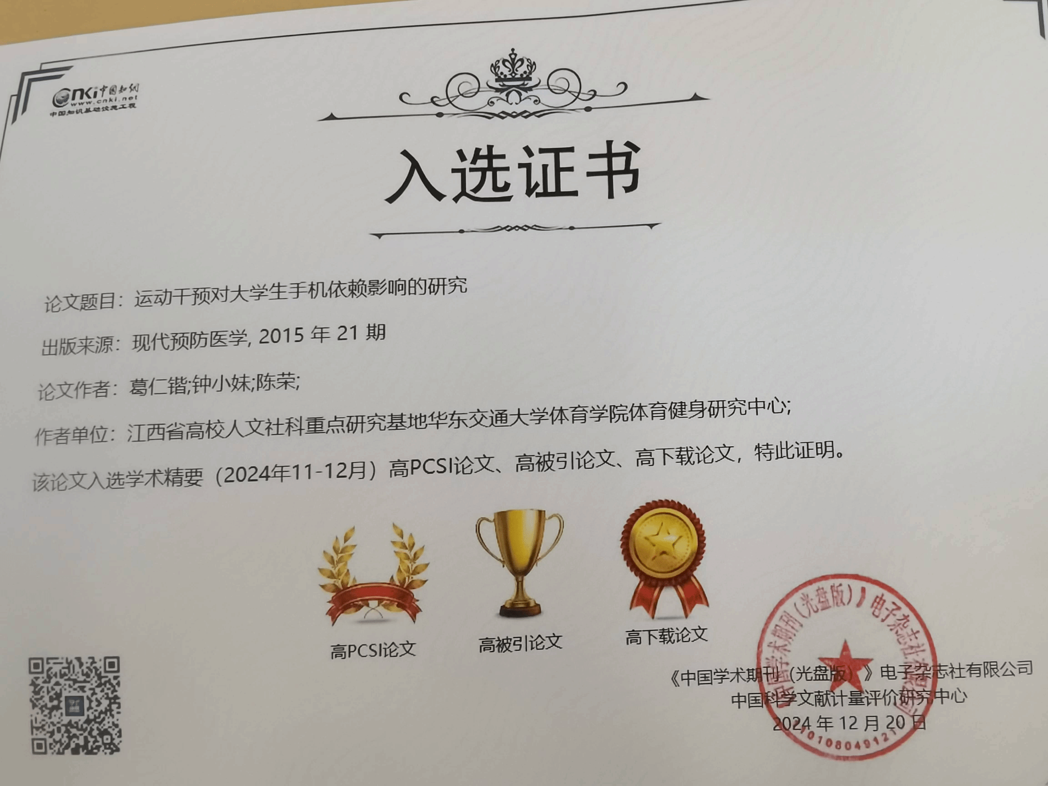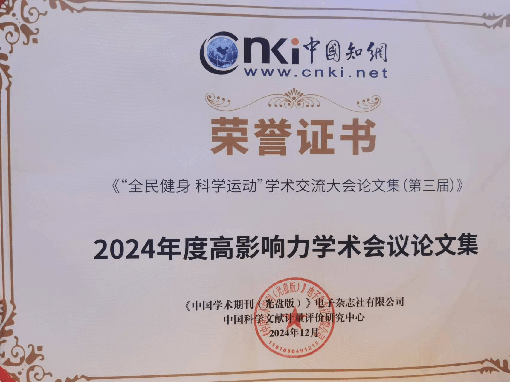 近日,“2024年度知网学术影响力评价系列报告发布会”在北京举行,大会发布了《2024年度“中国知网高被引学者”遴选结果》《2024年度“国际影响力TOP期刊”榜单》《科技期刊世界影响力指数(WJCI)报告》《中国学术期刊国际引证年报》《高影响力学术辑刊评价报告》《高学术影响力中国报纸评价报告(2024)》《高影响力学术会议论文集评价报告(2024)》。由beat365官网体健学院与江西省体育科学学会联合主办的《“全民健身 科学运动”学术交流大会论文集(第三届)》被评为知网社会科学类“高影响力学术会议论文集”TOP50榜首。beat365官网教师葛仁锴发表的论文《运动干预对大学生手机依赖影响的研究》入选学术精要高PCSI论文、高被引论文、高下载论文。