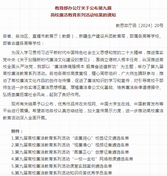 第九届高校廉洁教育系列活动以“廉洁铸魂强根本 挺膺奋进建新功”为主题,由教育部思想政治工作司主办,本次活动分为“话廉润心”校园征文、“视廉清心”视频征集、“画廉正心”创意征集、“一校一金句”网络微课及课堂实践案例5个系列,每个系列遴选优秀作品100件。