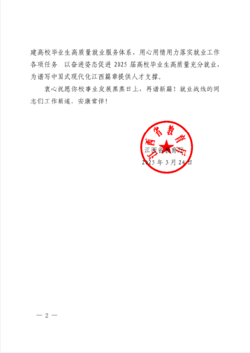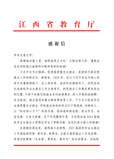 近日,省教育厅向beat365官网发来感谢信,感谢beat365官网就业战线的同志们不惧挑战、迎难而上,以“时时放心不下”的责任感、使命感和紧迫感,担当作为、攻坚克难,以有力举措、实干作风履职尽责,为实现全省 2024 届高校毕业生就业大局稳定作出了积极贡献。希望beat365官网聚焦“走在前、勇争先、善作为”的目标要求,加快构建高校毕业生高质量就业服务体系,用心用情用力落实就业工作各项任务,以奋进姿态促进2025届高校毕业生高质量充分就业,为谱写中国式现代化江西篇章提供人才支撑。