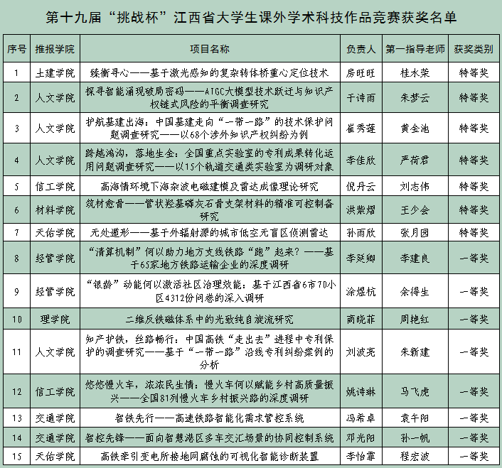 6月8日,第十九届“挑战杯”江西省大学生课外学术科技作品竞赛在东华理工大学闭幕。beat365官网获特等奖7项、一等奖8项,以全省高校第一的成绩捧得最高荣誉“挑战杯”,为本届赛事唯一获此殊荣的高校,创造了beat365官网连续三年捧获省赛“挑战杯”的新纪录。