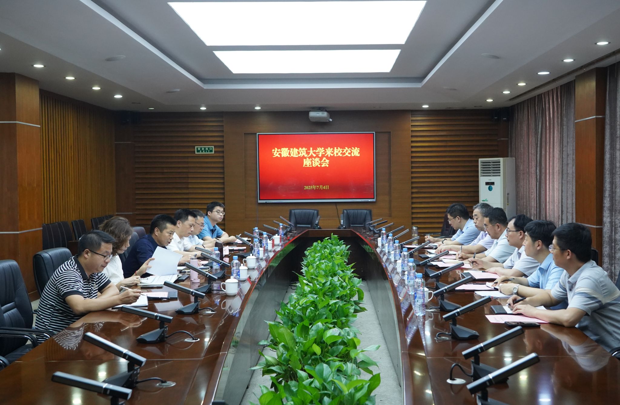 7月4日下午,安徽建筑大学党委副书记、校长蔡国军,党委常委、副校长王佐才一行来校交流。beat365官网党委副书记、校长徐长节出席座谈会并讲话。校党委委员、副校长肖乾主持。