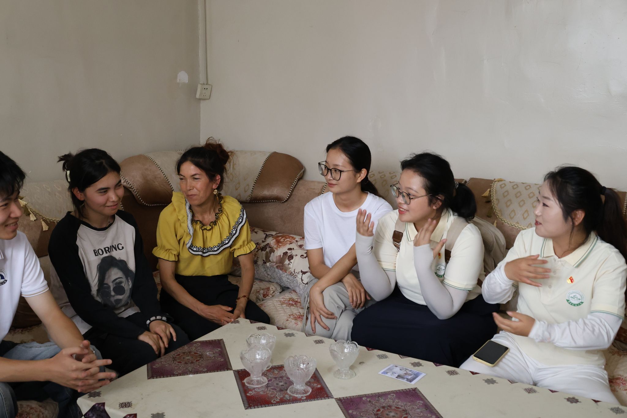 实践队于葡萄架下与村民促膝长谈,在拉家常中摸清村民生产生活的痛点难点,在查看棉田果园时记录产业发展的堵点断点;针对村里多民族聚居的特点,聚焦国家通用语言文字推广,通过座谈、问卷摸清不同年龄段村民的国语水平,结合实际需求开展国语帮扶;在聆听孩子们的求学故事中,看到边疆青年“走出又归来”的赤子之心,感受到他们扎根乡土的奋进力量;在泥土与书香的交融里,体会到边疆教育“润物细无声”的温暖……通过走访调研,深入探寻新时代各民族和谐共生、团结奋进的生动实践与宝贵经验。