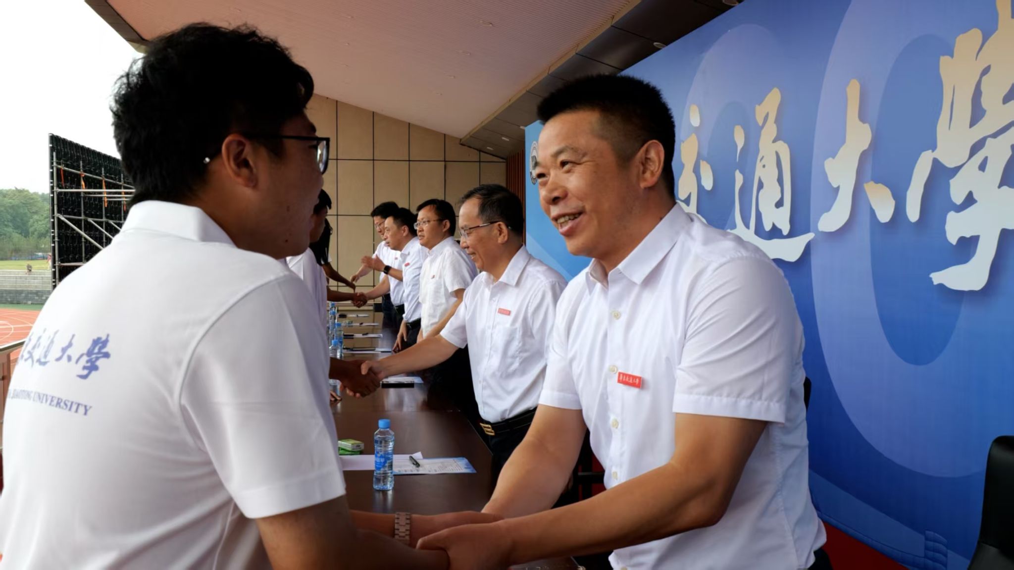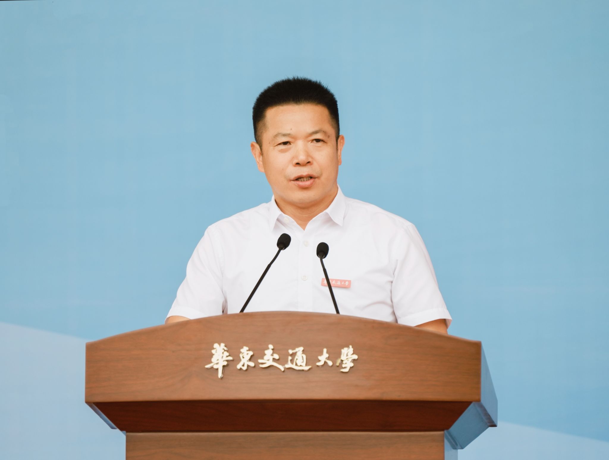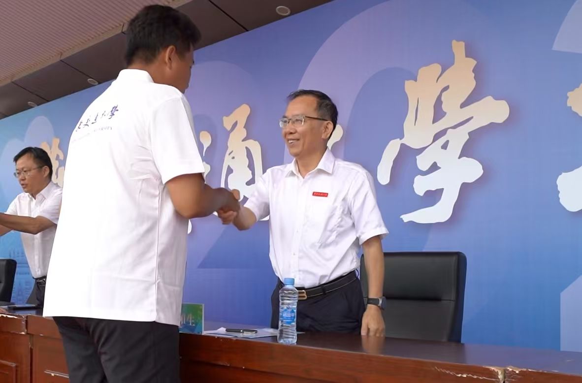 在庄重的佩戴校徽仪式中,校领导与嘉宾为新生代表佩戴校徽,全体新生自行将校徽佩戴于胸前,标志着正式成为一名华交人。一枚枚校徽不仅象征身份,更承载着“日新其德、止于至善”的校训精神。