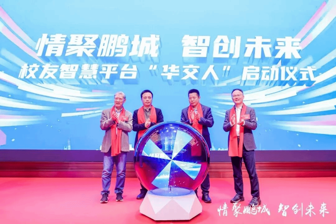 徐长节、肖乾,原学校党委书记、广东省校友会名誉会长、深圳校友会名誉会长、珠海校友会名誉会长李相夫,深圳校友会会长平如钢共同启动“华交人”线上互动端。