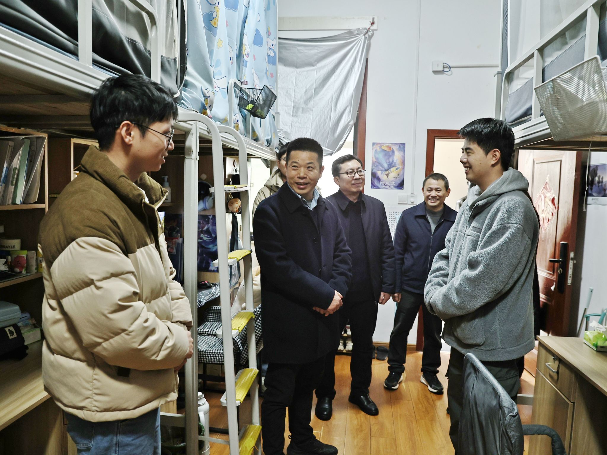 在北区研究生宿舍,徐长节一行实地查看住宿环境、消防设施、卫生状况,与研究生亲切交流,询问学习就业生活等情况,要求相关部门加强宿舍安全巡查与文明创建,为学生营造安全、整洁、温馨的居住环境。