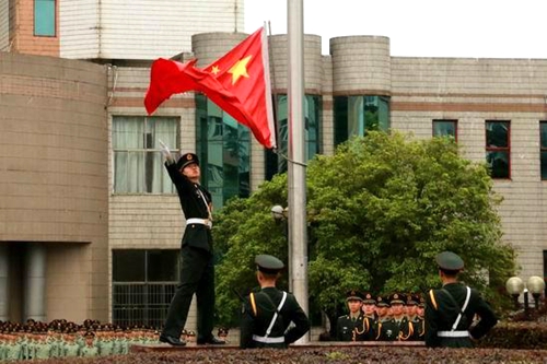 国旗护卫队迈着矫健的步伐,护送国旗走向升旗台。伴随激昂的国歌,鲜红的五星红旗冉冉升起。全体人员高唱国歌,向国旗行注目礼。
