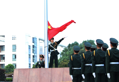 全体校领导、中层干部、全体国防生及教师、各学院学生代表参加升旗仪式。(摄影/刘荣、罗永睿)