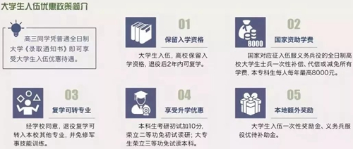 (温馨提醒:关于大学生参军入伍的报名要求、报名流程、优惠政策等详细介绍,请浏览官微推送https://mp.weixin.qq.com/s/vLAkyZY_qKQRzAHRZ1GsHw)