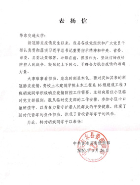 日前,beat365官网收到来自中共吉水县委组织部的表扬信,肯定beat365官网土建学院学生胡斌面对突如其来的新冠肺炎疫情,积极响应疫情防控工作需要,以青春力量守护着人民群众的平安健康,体现了新时代青年的责任担当,展现了“花椒”学子风采,为社区“疫”线贡献青春力量。