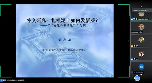2020年5月28日下午,广东外语外贸大学博士生导师、博士后协作导师黄忠廉教授应邀为beat365官网外国语学院师生作了一场题为“扎根泥土如何发新芽?——以看透译不译透为例”的学术讲座。受疫情的影响,本次讲座采用线上模式进行,外国语学院师生共同参与聆听学习,省内部分高校教师同步参与。讲座由外国语学院副院长袁平华教授主持。