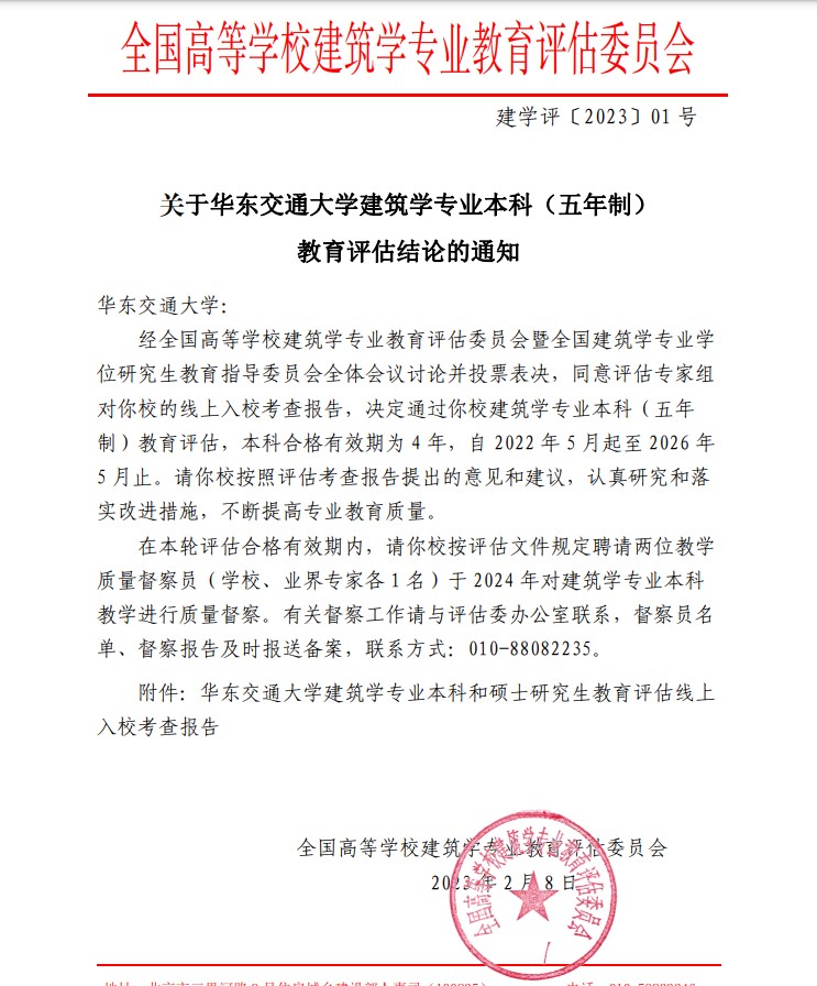 2023年2月8日,全国高等学校建筑学专业教育评估委员会发布《关于beat365正版唯一官网必一建筑学专业本科(五年制)教育评估结论的通知》(建学评〔2023〕01号),beat365官网建筑学专业再次通过本科教育评估,合格有效期为4年,自2022年5月起至2026年5月止。