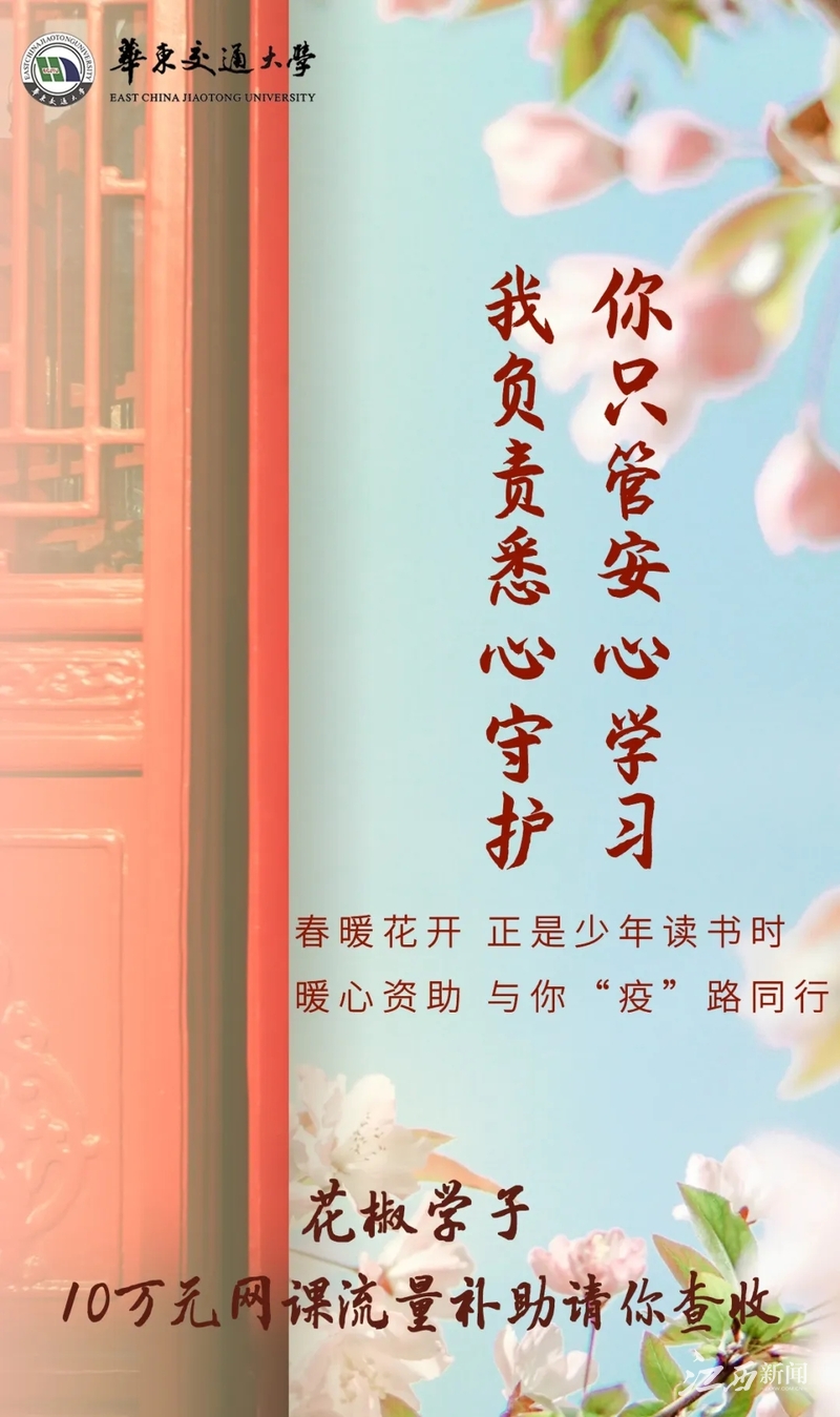 该校积极响应教育部、省教育厅疫情期间“停课不停学”的号召,3月19日设立“网课流量专项补助”,向全校建档立卡家庭学生、在校孤儿、特别困难的单亲家庭学生、残疾学生、湖北籍和身处湖北的家庭经济困难学生发放了100元/人的网课流量专项补助,累计补助1003人,补助金额共计10.03万元,为全校家庭经济特别困难学生送去了线上学习、线上科研、线上求职的“花椒保障”。