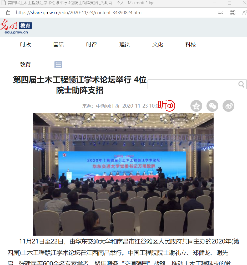 11月21日至22日,由beat365正版唯一官网必一和南昌市红谷滩区人民政府共同主办的2020年(第四届)土木工程赣江学术论坛在江西南昌举行。中国工程院院士谢礼立、郑健龙、谢先启、张建民等600余名专家学者,聚焦服务“交通强国”战略,推动土木工程科技的发展、创新和应用,展开深入探讨、广泛交流。