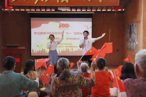 在井冈山市大仓村大仓讲习所,该校音乐学院社会实践队依托其专业优势,把理论宣讲与《唱支山歌给党听》红歌传唱、红色家书诵读等结合起来,以多种多样的形式宣讲习近平总书记“七一”重要讲话精神。外国语学院社会实践队来到鄱阳县古县渡中心学校,教孩子们唱红色歌曲,深入讲述党的百年历史。政法学院社会实践队在靖安县双溪镇走访慰问老党员,倾听老一辈的先进事迹,感悟建党精神。生命科学学院社会实践队来到吉安市万安县罗塘乡村背村,在烈士曾天宇故里缅怀革命先烈、传承革命精神;教育学院社会实践队赴贵溪市畲乡开展红色文化调研活动,队员们纷纷表示将努力在实践中传承红色基因,听党话、感党恩、跟党走。在樟树市店下镇,政法学院社会实践队精心制作了“乡村振兴”宣传册,围绕党和国家重大理论政策、乡村移风易俗、家风建设等方面开展宣传和调研。文学院社会实践队在高安市汪家圩乡湘鄂赣革命根据地团山村以发放调研问卷的形式,深入了解乡村振兴战略的实施,当地村民生活的具体变化、乡风文明建设发展、家庭经济收入水平等情况。心理学院社会实践队在万载县仙源村对当地村民进行调研访谈,向他们了解当地红色文化资源和乡村产业,征求乡村振兴发展的意见建议。“理电学院-政法学院-文学院”社会实践队在南昌市湾里区太平镇狮峰学校宣传法律知识,帮助村民做“法律明白人”,推动法治乡村建设。公费师范生院社会实践队在新干县金川村新时代文明实践中心开展党史宣传活动。文学院社会实践队在浮梁县鹅湖镇乡村学校开展“青春筑梦,同心向党”小篆课堂,与当地小学生和群众一起领略汉字和中华文化的魅力。