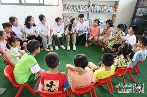 “五星红旗迎风飘扬,胜利歌声多么响亮,歌唱我们亲爱的祖国,从今走向繁荣富强……”实践团成员教孩子们唱红歌《歌唱祖国》《强军战歌》《我们走在大路上》,“希望能以歌曲传唱等有趣的形式来增强孩子们对祖国、对党的自豪感,从小在心中埋下一颗‘强国有我,请党放心’的种子”。