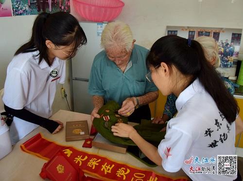 在潢溪镇丁山村95岁抗美援朝老兵赵早生的家里,响起了阵阵歌声,“一条大河波浪宽,风吹稻花香两岸……”《我的祖国》是描写抗美援朝影片《上甘岭》的主题曲,当赵早生再次听到这首熟悉的歌曲,情绪激昂,忍不住给队员们竖起大拇指,赞出一句“英雄之歌”。赵早生虽已满头白发,回忆起当年岁月依然精神矍铄,他自豪地向实践团成员展示曾获得的勋章,这是老党员一生最大的财富。