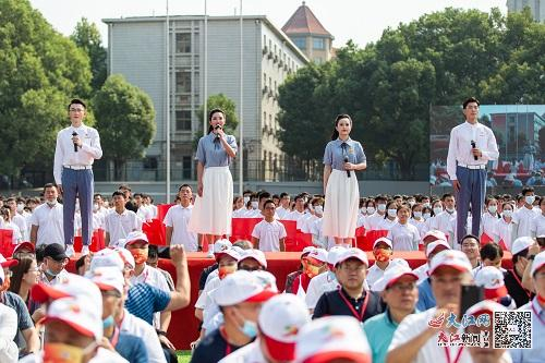 《星辰大海》《二十年后来相会》《赞赞新时代》《青春畅想》……大会开始前,4000名2021级大一新生组成4个巨型方阵,共同唱响昂扬奋进的青春旋律。在万众欢呼中,“贵赣情·校友行”千里接力“风火轮”跑团,与各地校友代表和师生代表,豪迈地迈进大会现场。伴随着热情铿锵的青年学生献词,巨型方阵变换成中国共产党成立100周年庆祝活动标识、中国地图、中国铁路路徽等图案或字样,彰显了全体华交人铁心跟党走、铁肩担使命的赤诚与担当。
