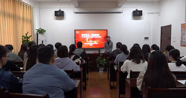 豫章师范学院思政课教师周海燕博士从“审议通过《中共中央关于党的百年奋斗重大成就和历史经验的决议》、“两个确立”、马克思主义中国化的新飞跃、总结建党百年宝贵历史经验”等四个方面,结合江西红色文化和省情教情,融入校友陈赞贤、革命烈士姚名达的事迹为同学们宣讲党的十九届六中全会精神。