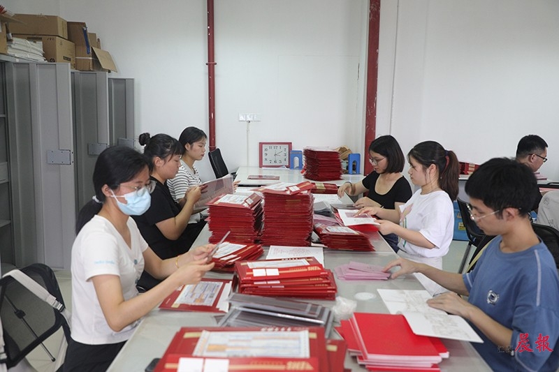 ▲高校工作人员正在分装录取通知书。