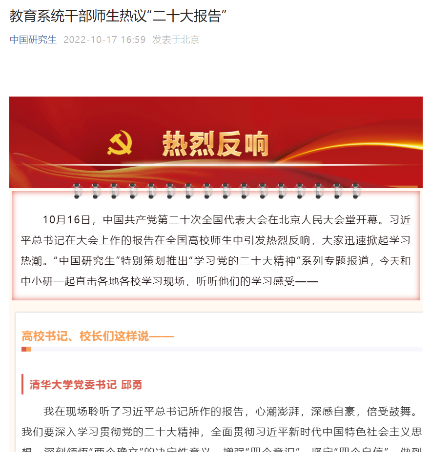 10月16日,中国共产党第二十次全国代表大会在北京人民大会堂开幕。习近平总书记在大会上作的报告在全国高校师生中引发热烈反响,大家迅速掀起学习热潮。“中国研究生”特别策划推出“学习党的二十大精神”系列专题报道,今天和中小研一起直击各地各校学习现场,听听他们的学习感受——