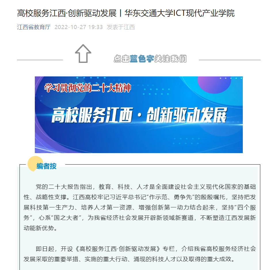 ICT现代产业学院利用江西布局发展新一代信息技术产业的战略契机,深入挖掘行业龙头企业的技术优势,面向产业发展对人才和技术的迫切需求,政产学紧密结合,构建了“政府-学会-高校-企业”多主体协同运行的办学实体,在技术创新和智力资源上实现了对产业转型发展的有效供给,创新驱动效应初显。
