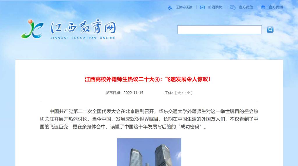 beat365正版唯一官网必一外籍教师DREW(美国)说:“我是来自美国的DREW,2019年来到江西南昌的beat365正版唯一官网必一任教,我很喜欢中国,很喜欢学校。今年召开了中国共产党第二十次全国代表大会,会上总结了十年来中国取得的辉煌成就,并提出要推进中国式现代化。我认为中国式现代化是总结自身经验、基于自己国情并结合各国现代化共同特征,提出的具有重要世界意义的现代化。我相信,在中国式现代化的指引下,中国会发展得越来越好。”
